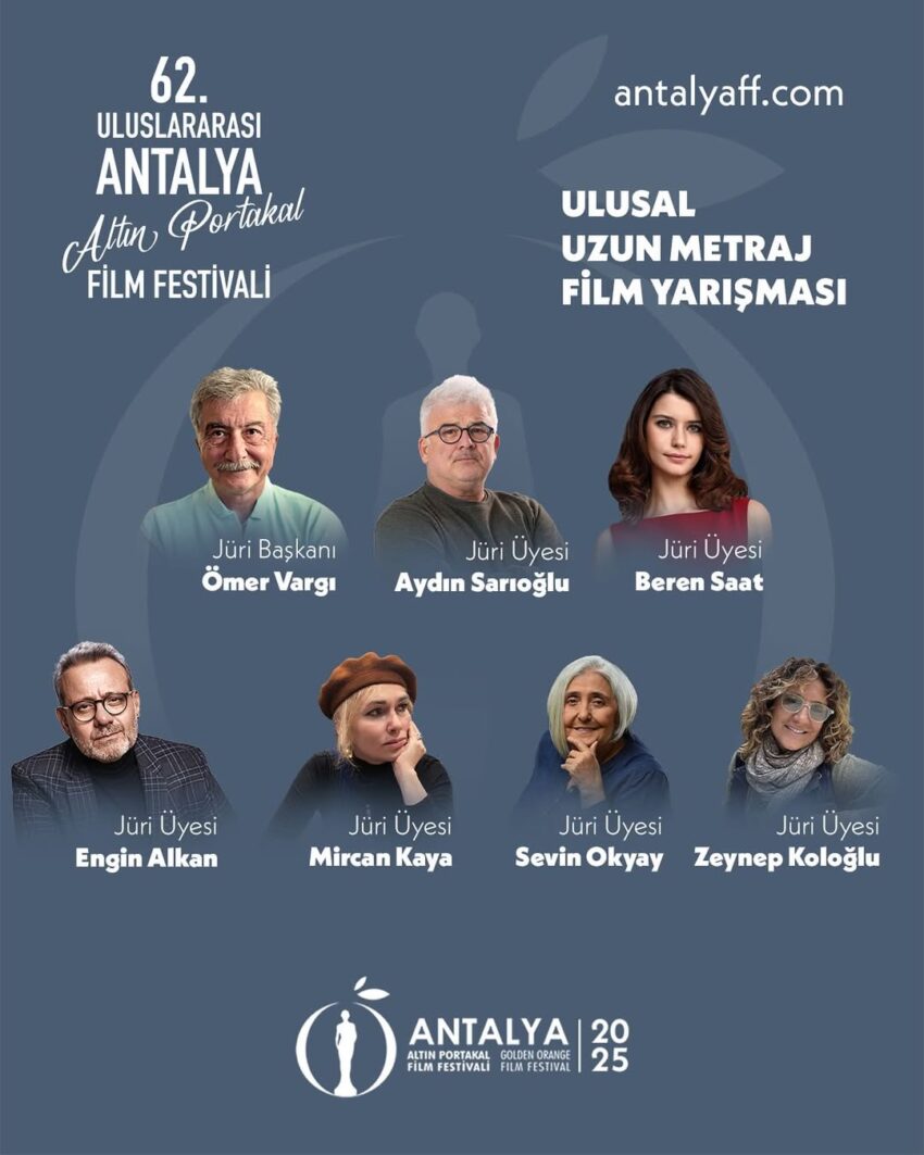 62. Uluslararası Antalya Altın Portakal Film Festivali Ulusal Uzun Metraj Film Yarışması Jürisinde; Eşkıya, Her Şey Çok Güzel Olacak ve Kabadayı ile Türksine yön veren usta yönetmen ve yapımcı, aynı zamanda jüri başkanı Ömer Vargı; 9 (Dokuz), Kavşak ve Omar ve Us filmleriyle tanınmış, birçok kayıtlı yapımda görev almış görüntü yönetmeni Aydın Sarıoğlu; Aşk-ı Memnu, Fatmagül’ün Suçu Ne? ve Atiye dizilerindeki performanslarıyla uluslararası alanda da bilinen oyuncu Beren Saat; tiyatro, sinema, televizyon ve seslendirme alanlarında çok yönlü kariyeriyle öne çıkan oyuncu ve yönetmen Engin Alkan; Uluslararası müzik sahnesinde Türkiye’yi başarıyla temsil eden müzisyen, yorumcu ve yapımcı Mircan Kaya ile kültür-sanat yazarlığı, çevirmenlik ve sinema eleştirmenliğiyle tanınan, SİYAD’ın ilk kadın üyesi Sevin Okyay yer alıyor.