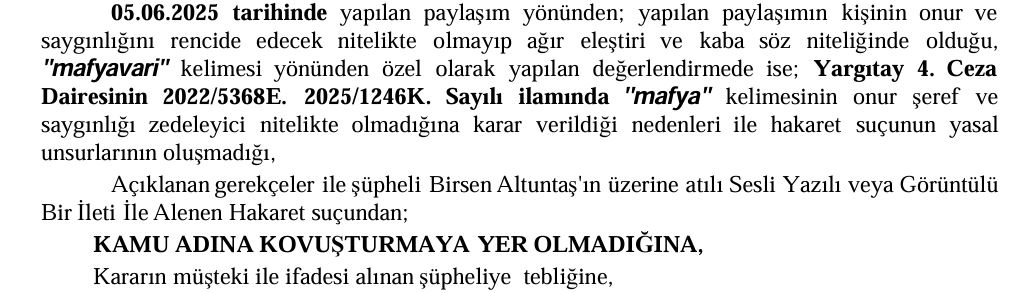 Savcılık “’mafya’ kelimesiyle ilgili yaptığı değerlendirmede Yargıtay 4. Ceza Dairesinin 2022/5368E. 2025/1246K. Sayılı ilamında ”mafya” kelimesinin onur şeref ve saygınlığı zedeleyici nitelikte olmadığına, kamu adına kovuşturmaya yer olmadığına karar verdi. Savcılık daha sonra Sangu’nun karara ettiği itirazını da reddetti.